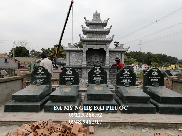 Với 1 khu lăng mộ đá phổ biến cơ bản sẽ bao gồm 1 số hạng mục chính như: bộ cổng đá khu lăng mộ, lan can hàng rào bằng đá, 1 lăng thờ chung, 1 bình phong đá ( cuốn thư đá) và các ngôi mộ đá nằm trong khuôn viên khu lăng mộ.